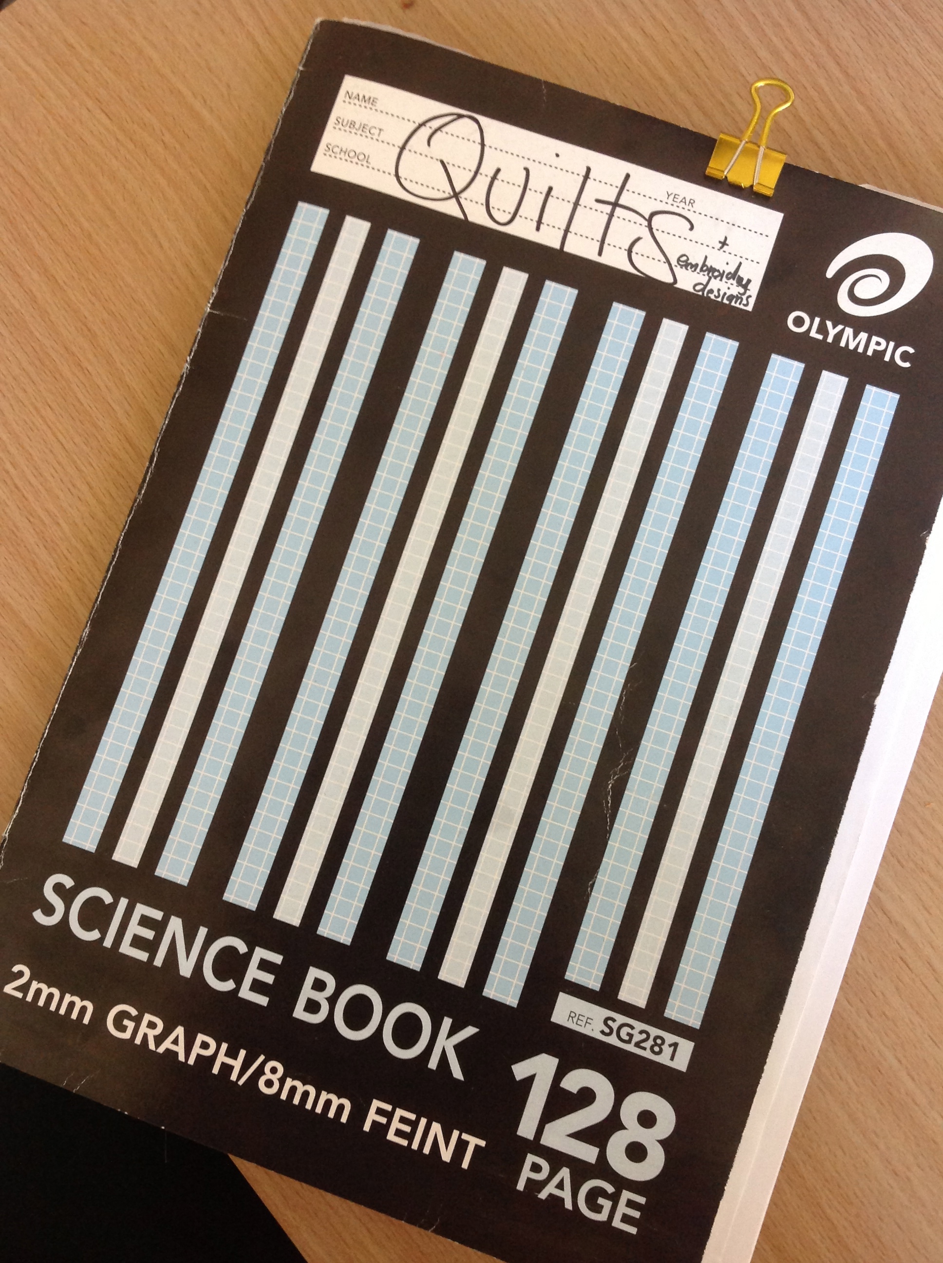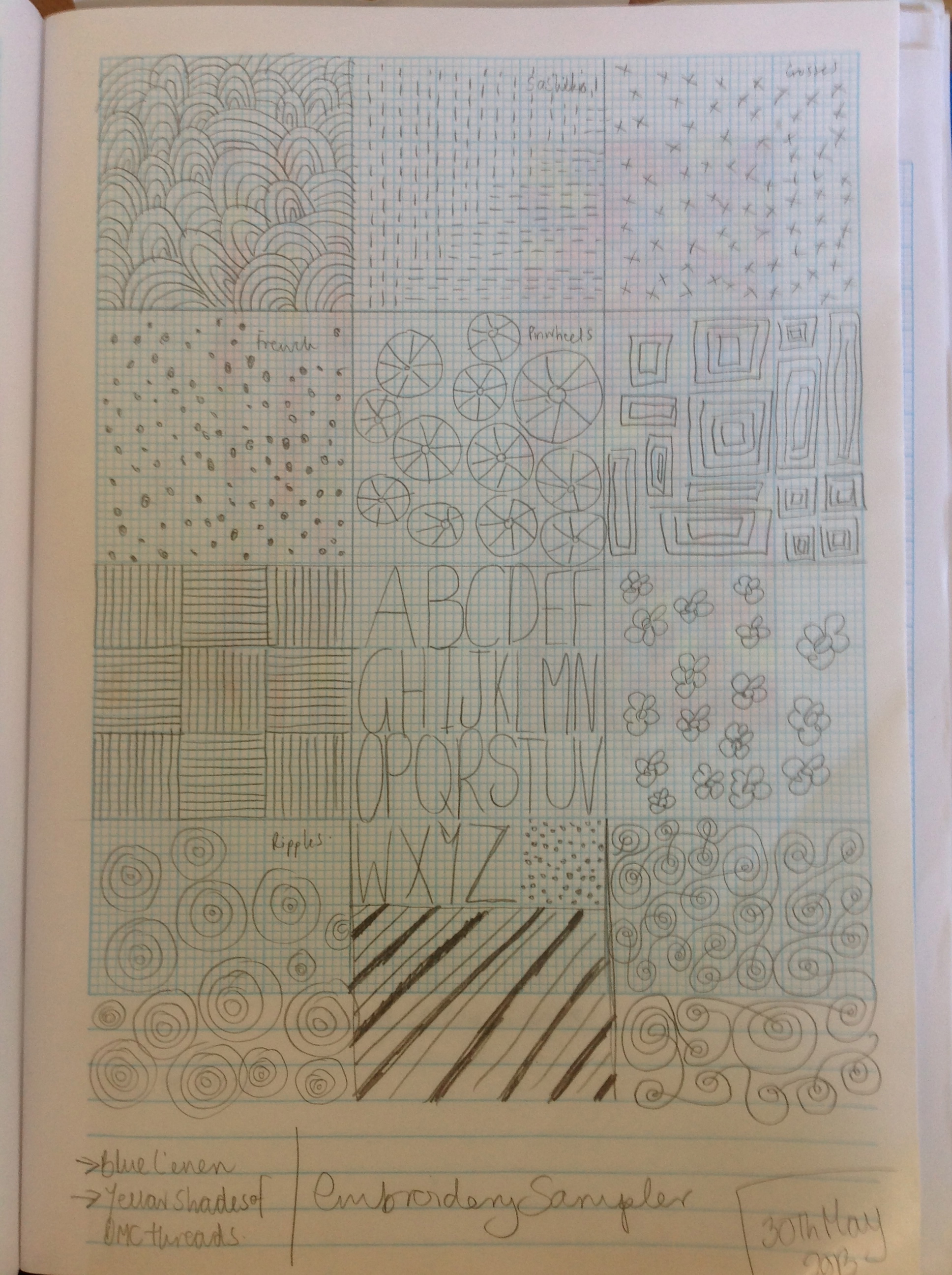 I use my notebook to draft future quilts I have in mind to make (when will I ever get the time!!) along with different embroidery designs. Here’s my ‘blueprint’ for the embroidery sampler I’m currently working on….