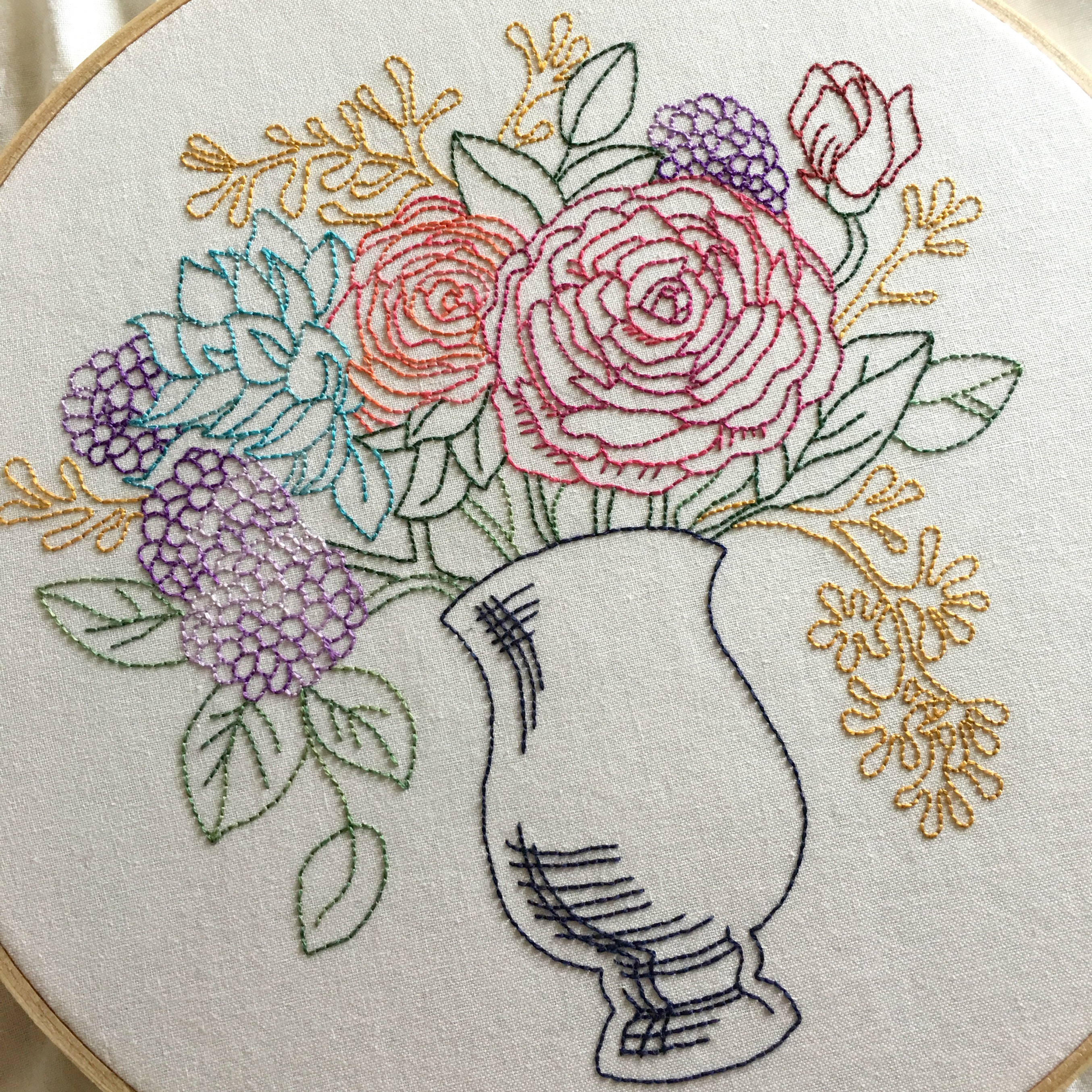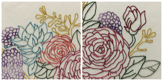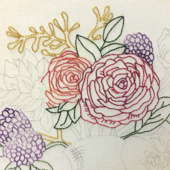 When figuring out what colours to use for this design, I put my Florist hat on and thought sensibly about what kind of flowers where in it and what types of colours they would be in real life. I knew instantly that I wanted to use a variegated purple thread for the fluffy hydrangeas on the left hand side and at the back of the arrangement. Hydrangeas come in so many beautiful colours and shades and I wanted to really show the lighter and darker changes that the little flowers making up a hydrangea head have.
