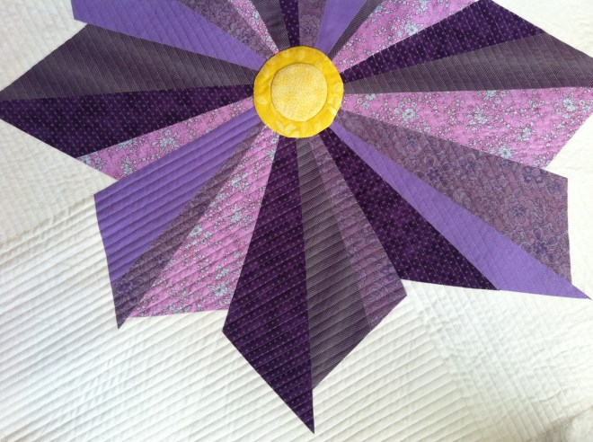 I chose randomly which petal blade got what purple print fabric because – well – because that’s just how I roll. I like to be spontaneous and try (very hard, with little success) not to over think things.