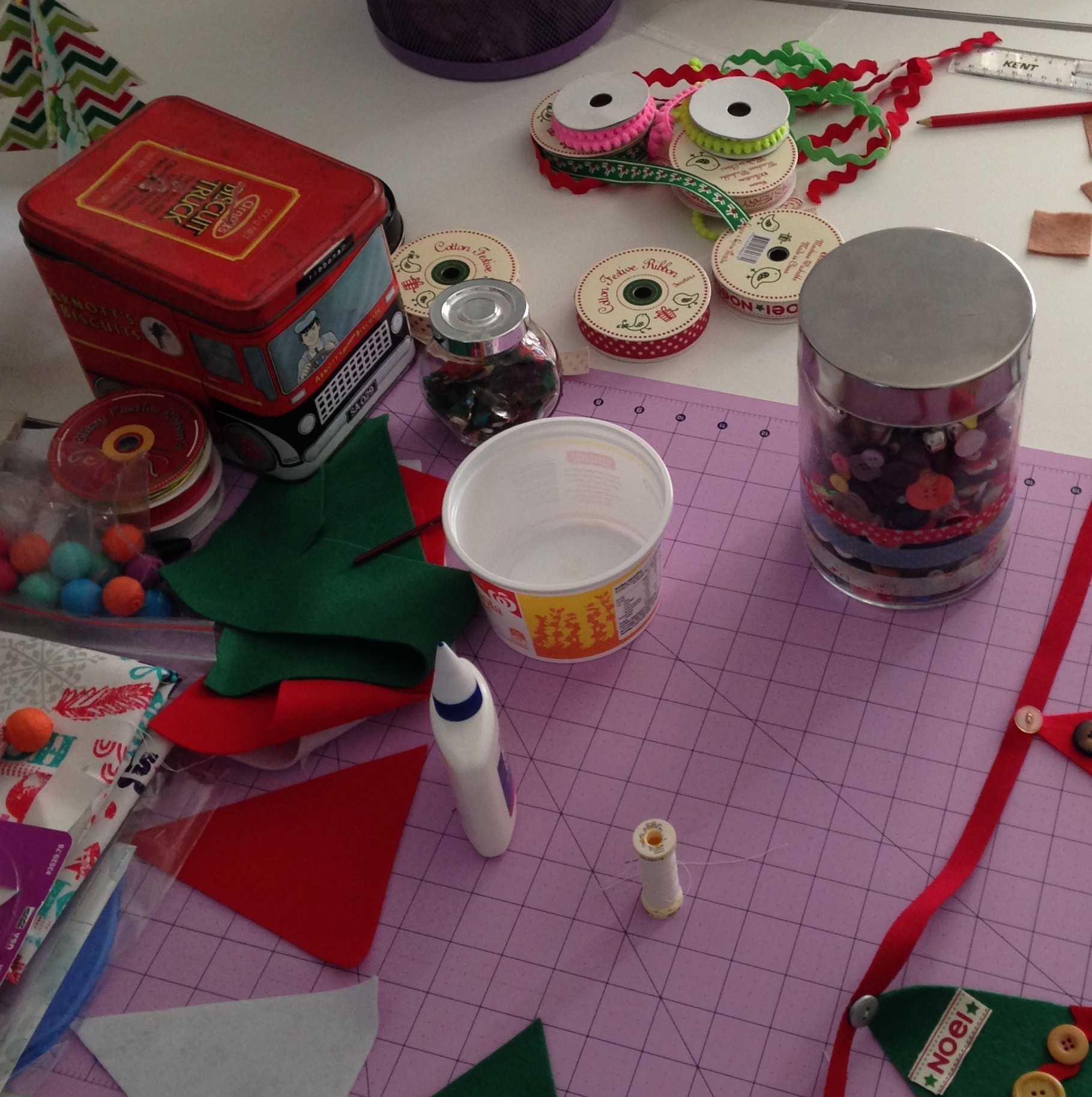 Here’s a glimpse of my sewing room from this week – nothing has changed today, it’s still covered in bits of felt, ribbon, sequins, buttons, PVA glue and christmas fabrics…