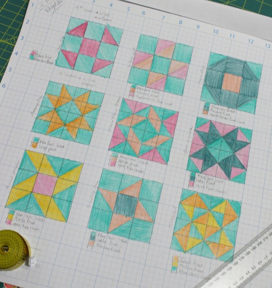 Now in regards to how much fabric you’ll need will all depend on if you’re going to use as many fabrics as I am. If you are, I would recommend in getting no more than a half metre or half yard cut of fabric for each print you’ll be using in your blocks. You possibly could get away with using Fat Quarters, but if you make a mistake with a certain block, you may come up short and I don’t want that to happen to you! For the background fabric, you’ll need at least two metres (2 yards) and no more than 1 metre (1 yard) of fabric for the binding. Once the quilt top has been completed, I’ll share how much backing and batting you’ll need to finish it off!