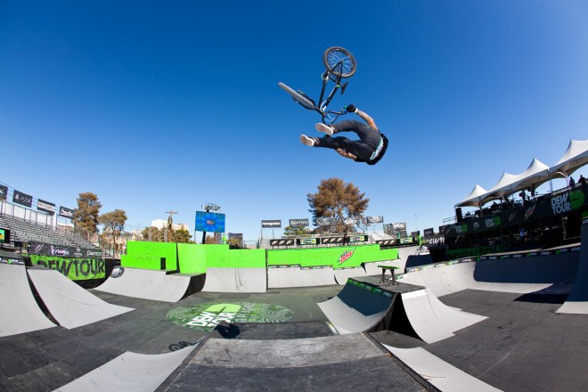 I was recently inspired to use a particular colour palette after watching the highlights of the 2011 Dew Tour on Fuel TV. I love the bright and vivid lime green that’s smattered around the Skate/BMX course and how the greys and black sit comfortably next to each other. These aren’t the best pictures, but you can see what I mean about that intense lime green!