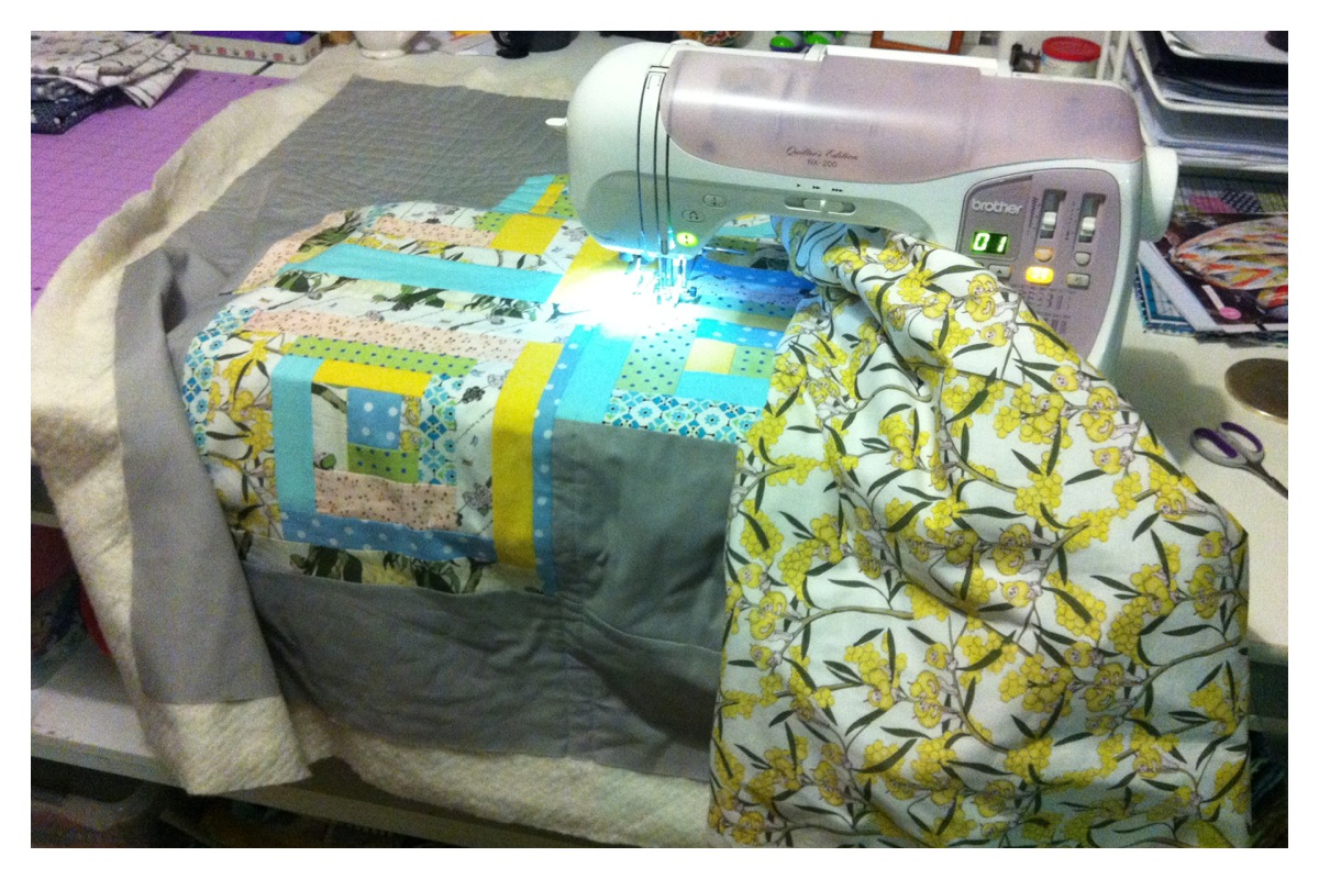 Just only a few moments ago this afternoon, I finished hand sewing the binding onto the Gumnut Babies Quilt – escaping with only a few needle pricks and my sanity still in tact! Tomorrow I will label and photograph it, share here with you on my blog and then pass it on to the lucky lady who gets to snuggle underneath it’s warmth and comfort. Here is the quilt being quilted during the week. I had fun playing around with the composition of the quilting lines to tie in with the modern approach I took to making this quilt.