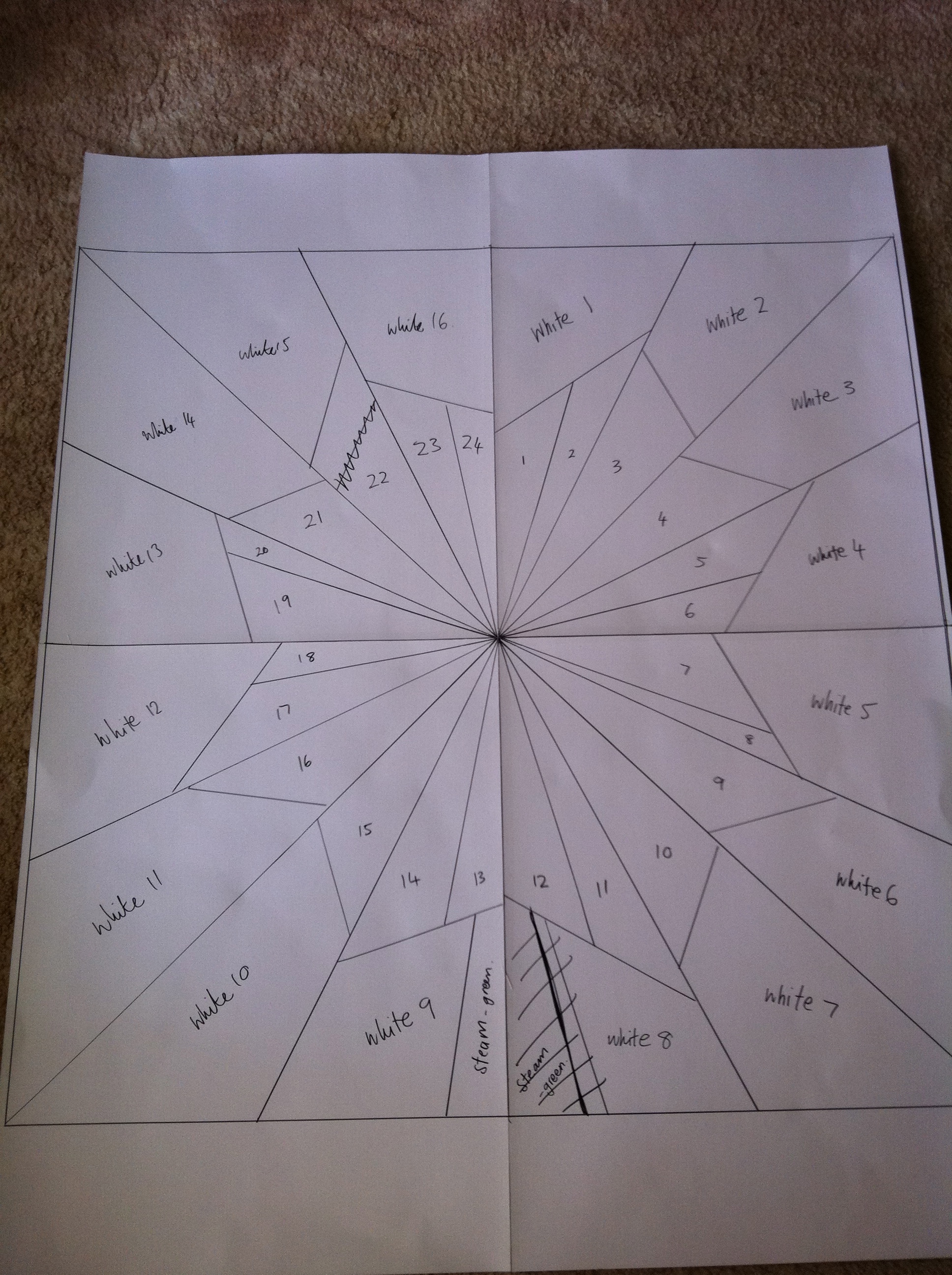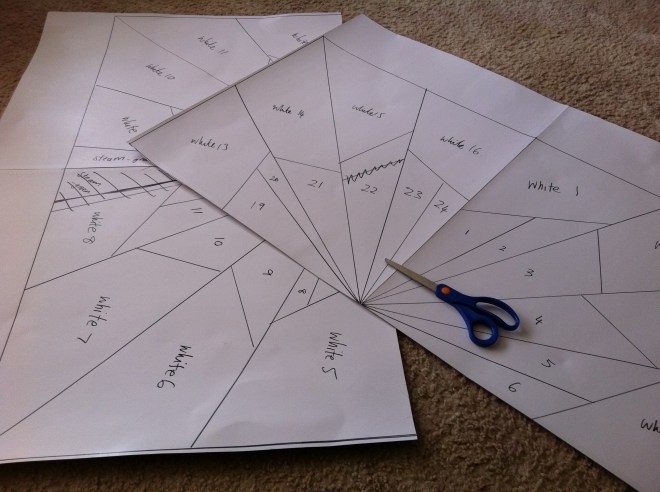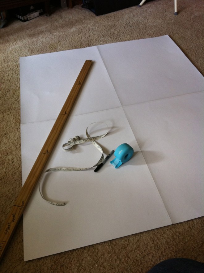 To start the paper piecing process, I bought four large pieces of poster board and sticky taped them together in a very professional manner (sprawled across the floor, butt in the air, tape hanging out of my mouth while my measure tape, hanging around my neck, tried desperately to strangle me to death!).