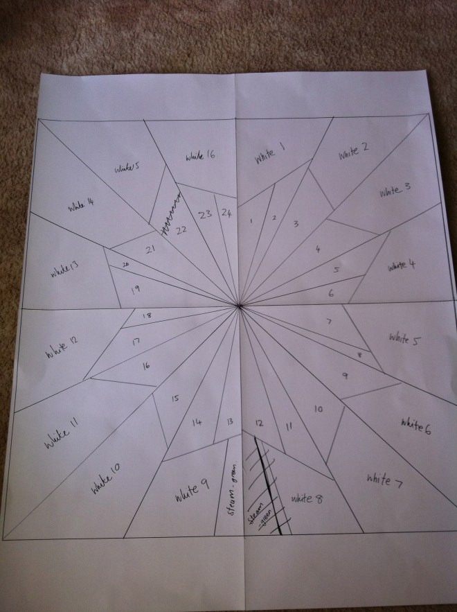 So that I wouldn’t be too overcome by cardboard everywhere, I cut and sewed back together the pieces in quarters; the first quarter of the flower design, then the second, third then fourth which then completed the quilt top.