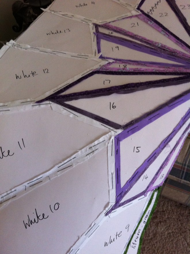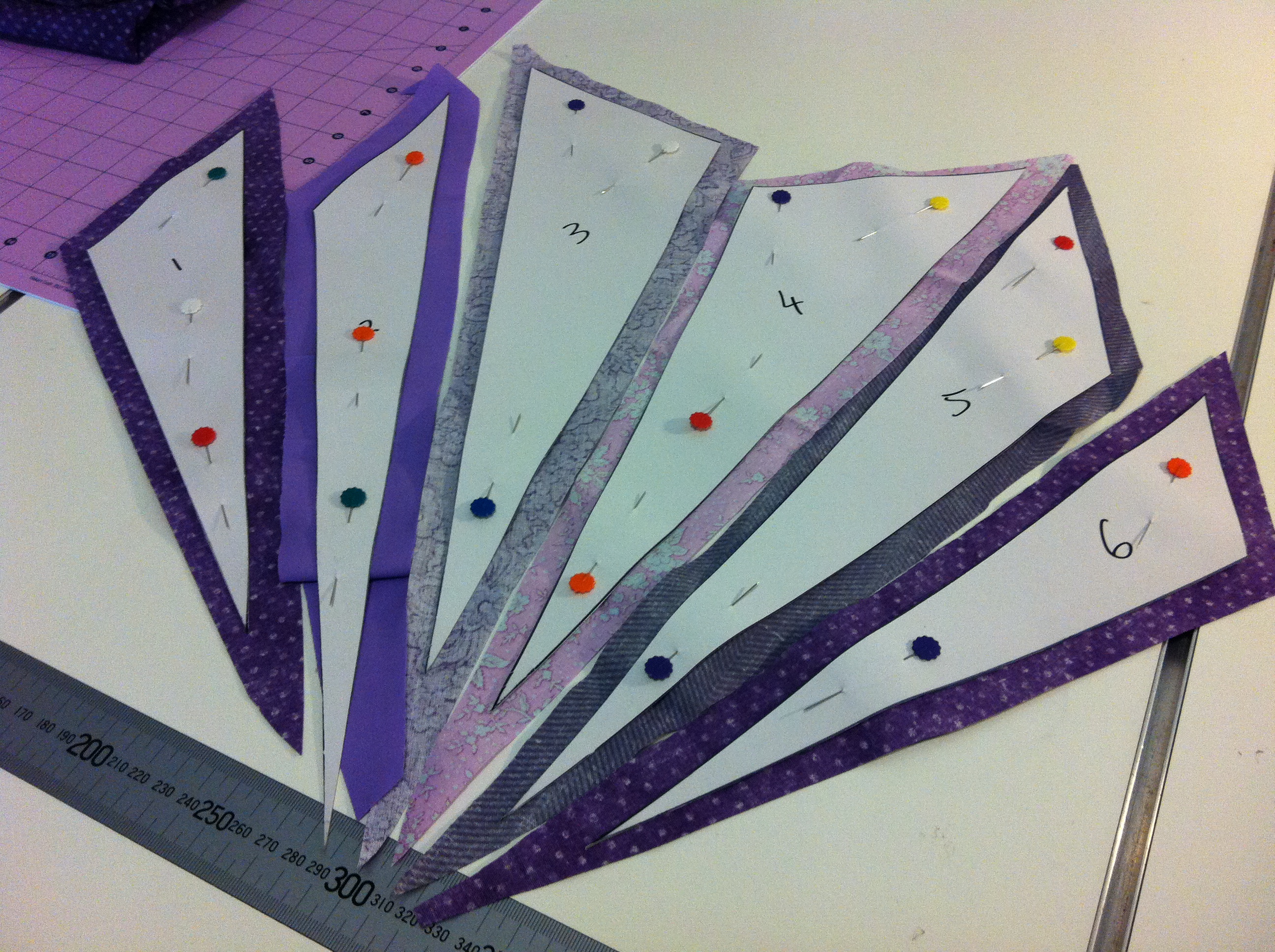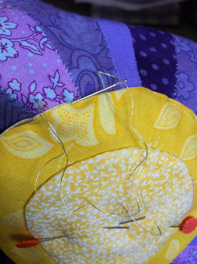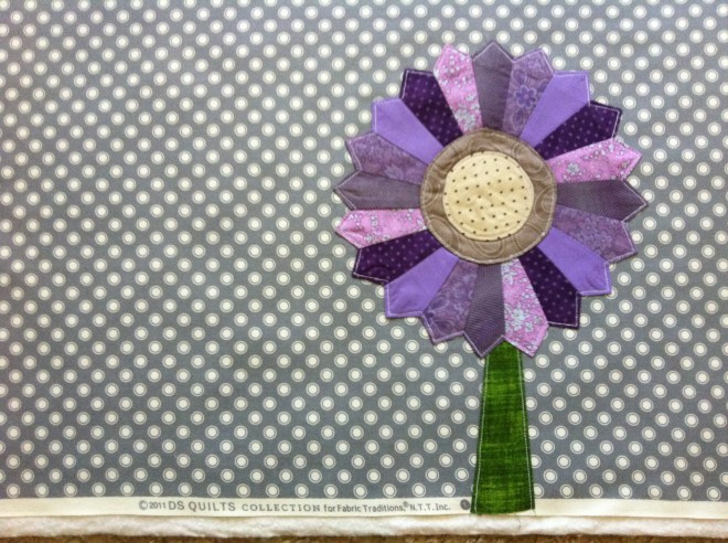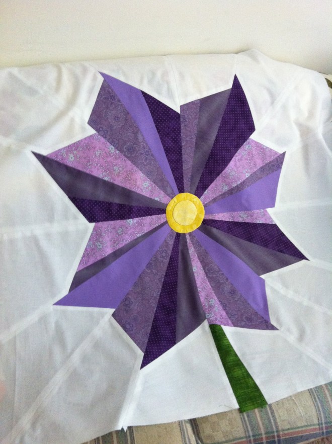 I chose randomly which petal blade got what purple print fabric because – well – because that’s just how I roll.  I like to be spontaneous and try (very hard, with little success) not to over think things.
