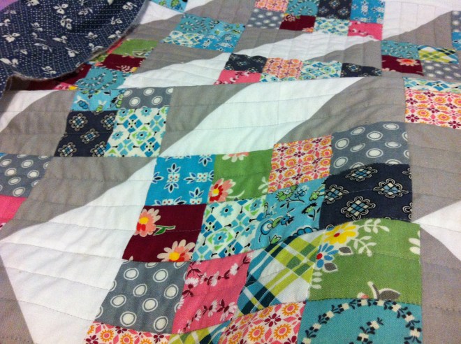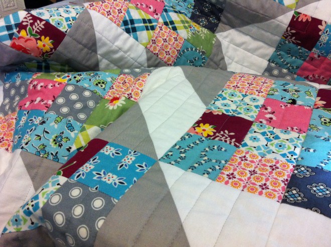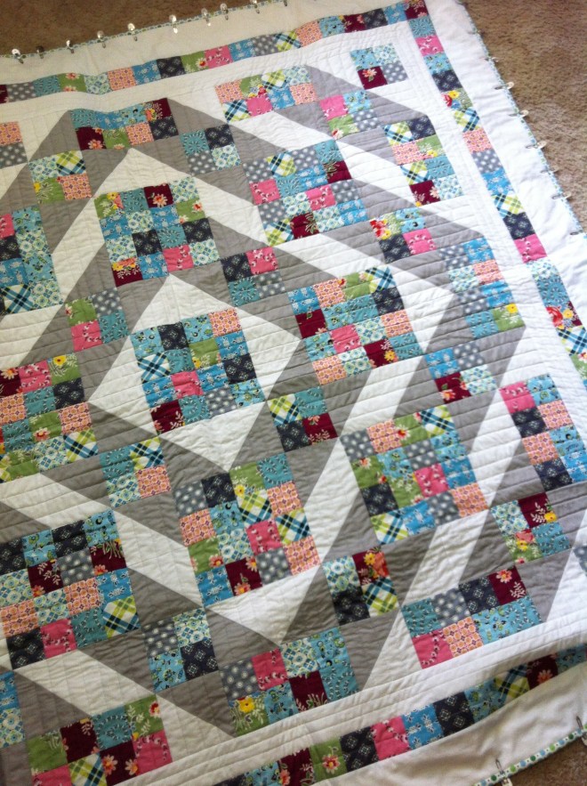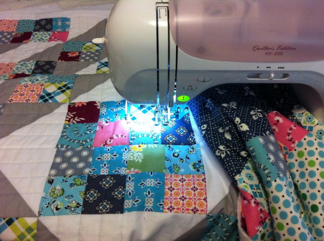All hand-quilting stitches have gone bye-bye and the quilt (along with my sanity and comfort) said a delightful ‘Hello!’ to my sewing machine and walking foot!