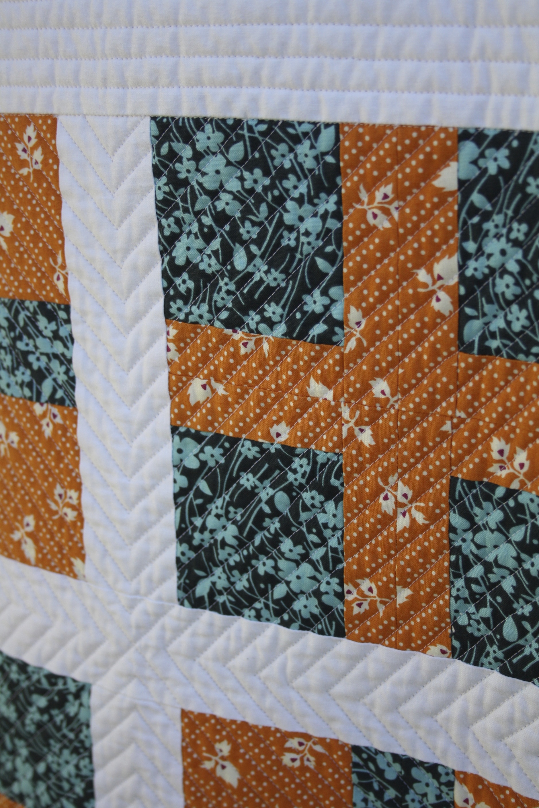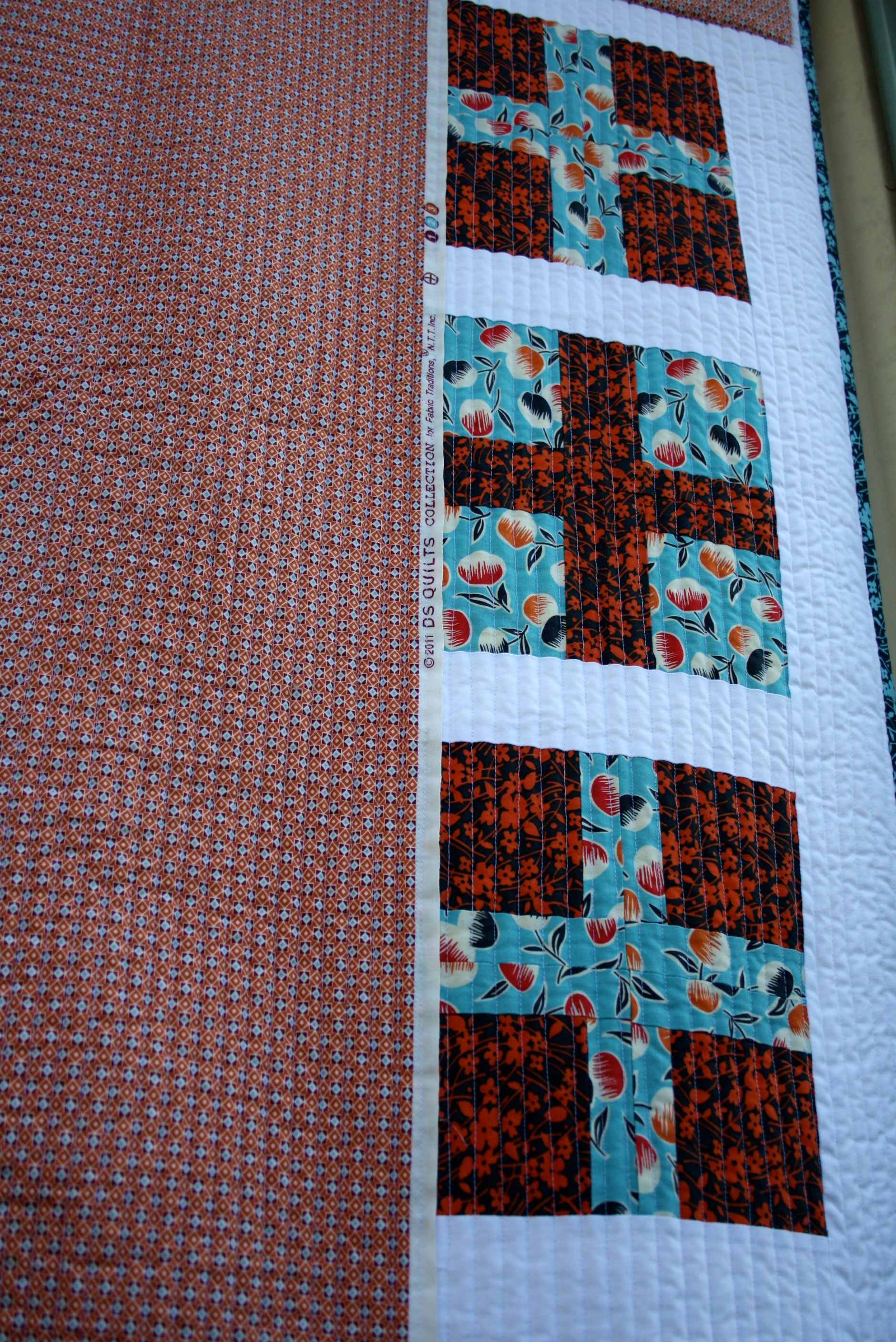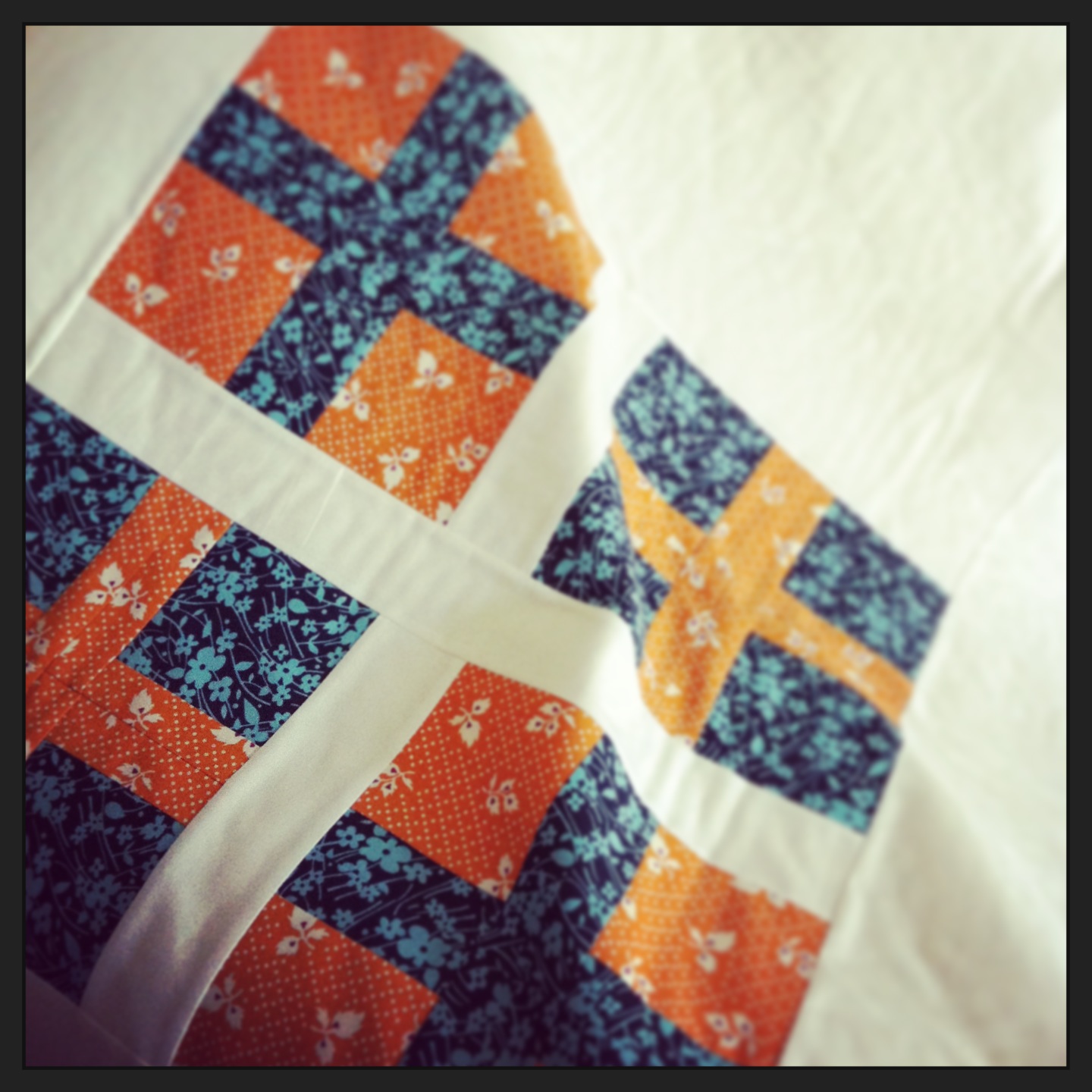 Last year, I bought some orange and blue DS Quilts fabric and played around with a quilty-cross technique I found on Pinterest.