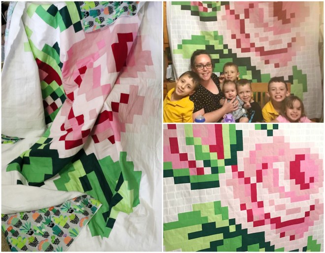 The end of January saw me finally piece together my mammoth Pixelated Rose Quilt top. I made it a priority to get it finished by months end to then begin quilting it. As of today, this quilt is half basted, roughly folded and hung loveless over a chair in our living room.