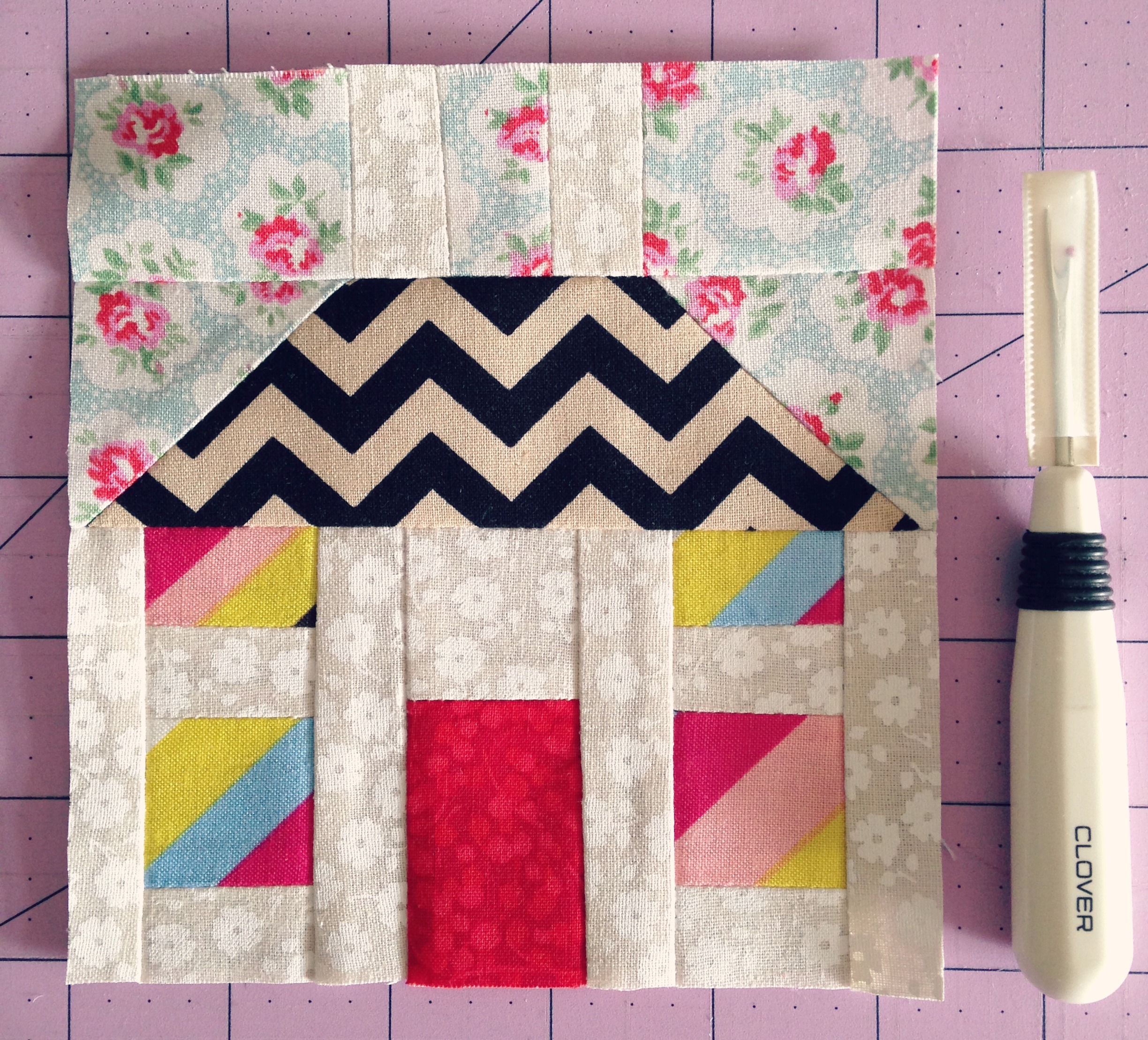 The part where I had the most difficulty was matching up the two chimney strips with the top edge corners of the roof. After piecing the allocated pieces together, I realised the centre square separating the two chimney strips was about half an inch too wide! So out came my trusty seam ripper and I patiently picked the two seams on either side of the square apart. (Remember, these pieces are super tiny, so my big fat fumbling fingers got in the way very easily!) I made the decision to cut a 1/4″ off from either side of the square, thus getting rid of the perforated surface that the stitching tension had caused and proceeded to try again. Success! Even though the pattern said to cut one 1&1/2″ square for this section, it ended up only needing a 1″x1&1/2″ strip.