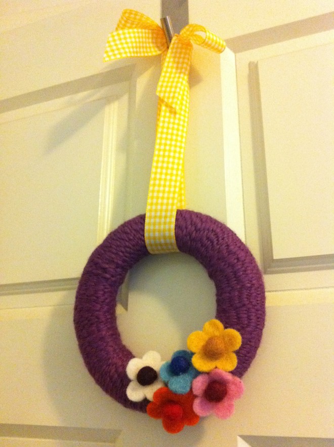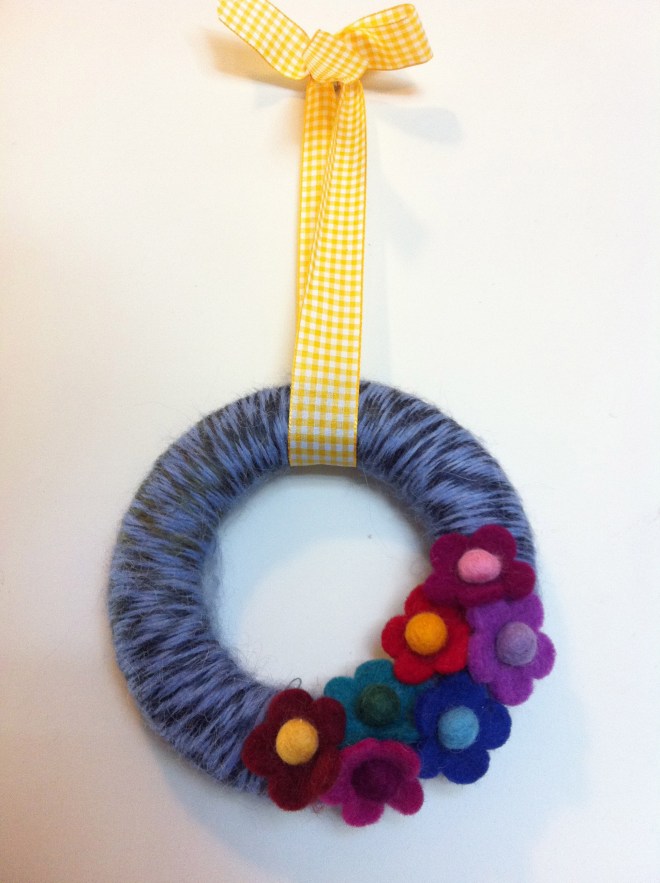 These were made by using left over knitting wool/yarn, wrapped hundreds of times around a foam wreath, hot-glue gunning store-bought felted flowers in a pretty bunch together and then attaching some contrasting ribbon as the hanger bit! Ta-dah! A pretty wreath for your front door! It took next-to-no-time to make and the materials where very cheap to buy. So get your craftiness on; make it and be surprised at the results!