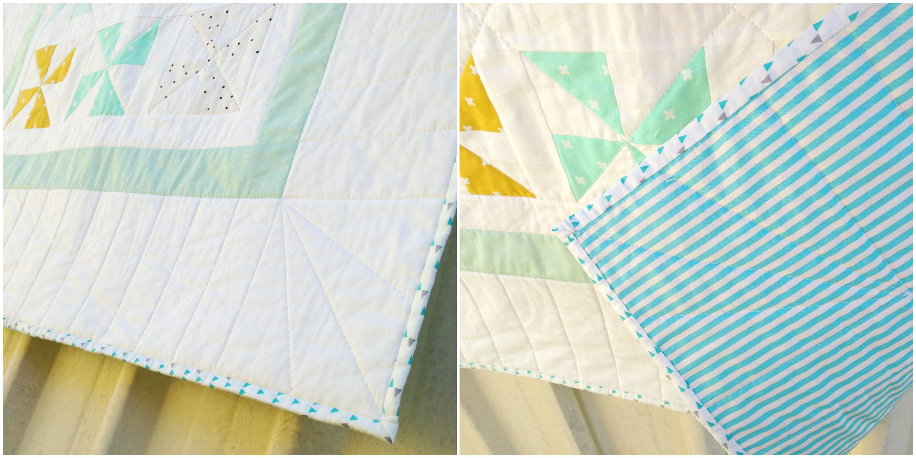 With this quilt, I tried my best to really ‘echo’ or be inspired by the shape of the pinwheel in my quilting. As you may know by now, I love to quilt my quilts using straight lines. And with this, I always love to challenge and stretch my self with the different ways I can do that by exploring direction, shape and density. I think you can really see that with this quilt, especially around the outside border and corners. (BTW: I love doing those little fan-like-designs in the corners, they look so Art Deco-y!) To help achieve the beautiful lines in this quilt, I again used my Clover Hera Marker to create lines in the right positions before quilting over them.
