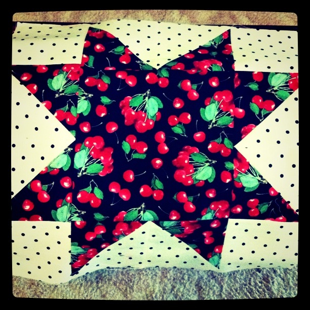 So obviously I’m currently working on the quilt for my best friend and am now at the stage of quilting it. Yay for me for getting over the one thing I dread most when quilt making and that’s basting! I hate basting! I procrastinate so much over it when it’s the next step. I can’t avoid it – it has been done so I can move on to quilting then binding then finishing! But I got over my internal whinging and just did it! I put on some U2 tunes, went to a happy place in my mind and basted away! I suppose, just thinking now, it wasn’t all that bad as this quilt is only lap size compared to queen sized quilts I’ve made – and they’re definately the worst to tackle! Anyway….enough of my ramble. Here’s a slight peek at the finished quilt top….I love it may I say…